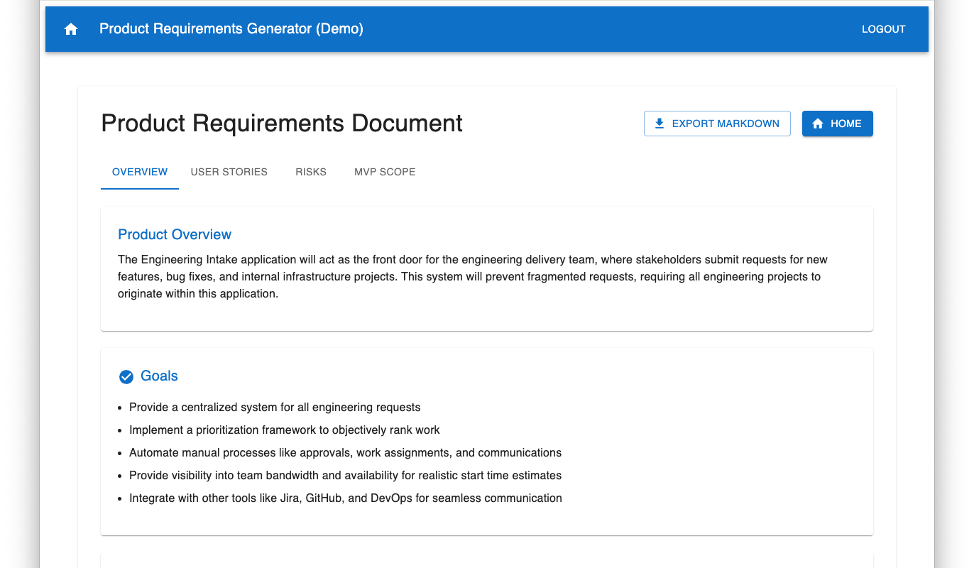 The Product Document Generator automates PRD creation by taking four simple inputs: