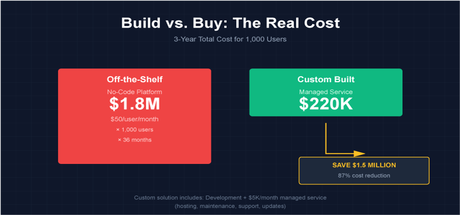 Compare this to your off-the-shelf software: When was the last time a vendor update broke your workflow? How often do you deal with integration failures? How much time goes into managing licenses and permissions?